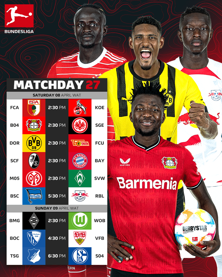 ตารางแข่งขัน บุนเดสลีกา เยอรมัน 2022/23 สัปดาห์ที่27 เริ่มแข่งคืนวันศุกร์ที่ เสาร์ที่ 7 เมษายน 2566 นี้ โดยโปรแกรม บุนเดสลีกา จะยังมีเตะต่อเนื่องไปจนถึงวันอาทิตย์ที่ 9 เมษายน เช็กโปรแกรมแข่ง ตารางการแข่งขัน ฟุตบอลรายการอันดับหนึ่งของลีกเยอรมัน เช็ก ช่องถ่ายทอดสดทาง PPTV ช่องทางดูบอลออนไลน์ได้ ที่นี่