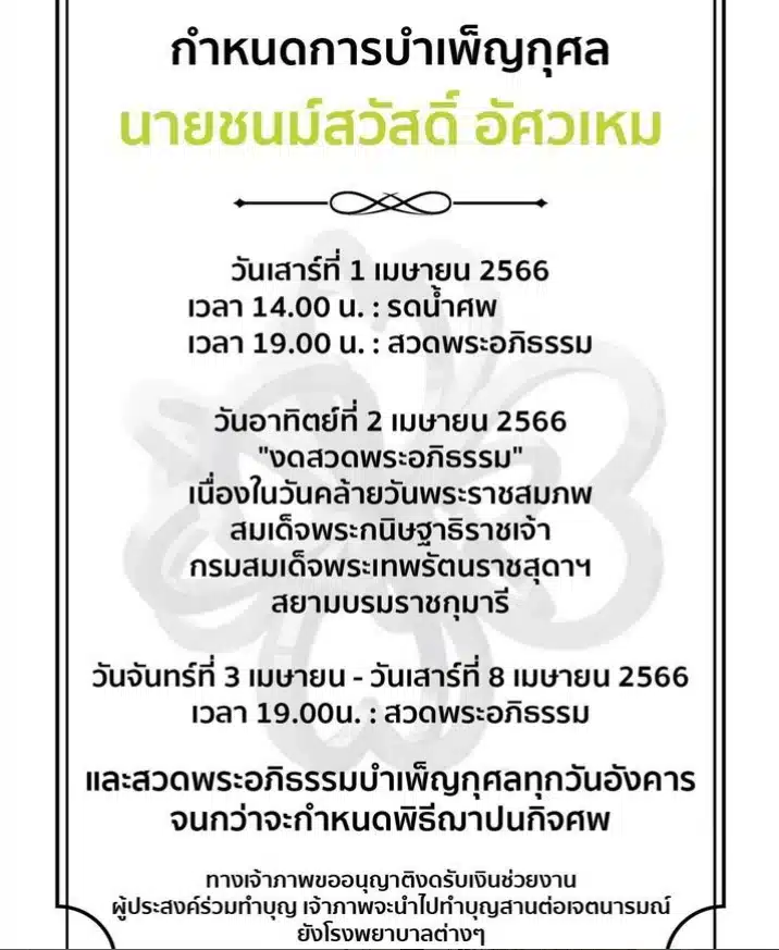 - วันจันทร์ที่ 3 เมษายน 2566 – วันเสาร์ที่ 8 เมษายน 2566 เวลา 19.00 น. สวดพระอภิธรรม หลังจากนี้จะเปิดสวดพระอภิธรรมทุกวันอังคาร จนกว่าจะกำหนดพิธีฌาปนกิจศพ.