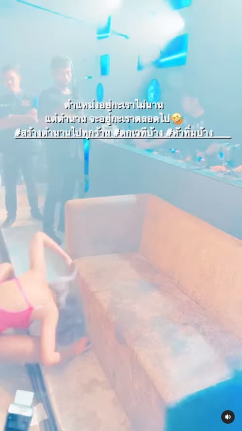 โดยในคลิปเราจะเห็นสาวนิวนิว กำลังทำท่านอนยกขาชี้ฟ้าอวดเรือนร่างแซ่บเวอร์ในชุดน้อยชิ้นบนโซฟา ก่อนที่จะกับเจอสถานการณ์จังหวะสะดุดทำให้เสียการทรงตัว จนตีลังกาหัวทิ่มตกโซฟา !