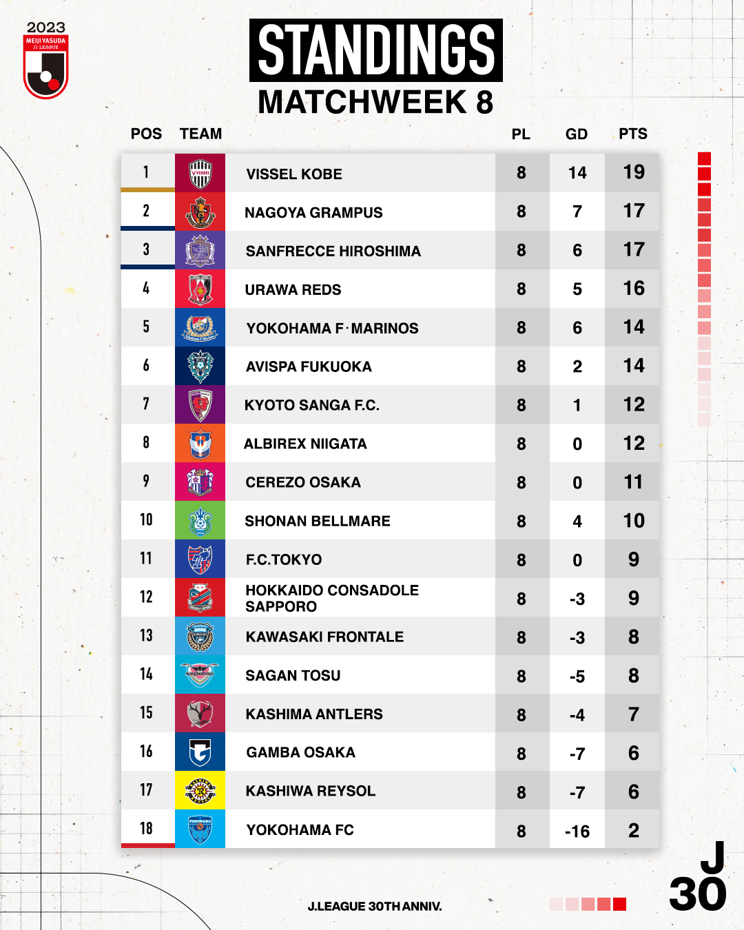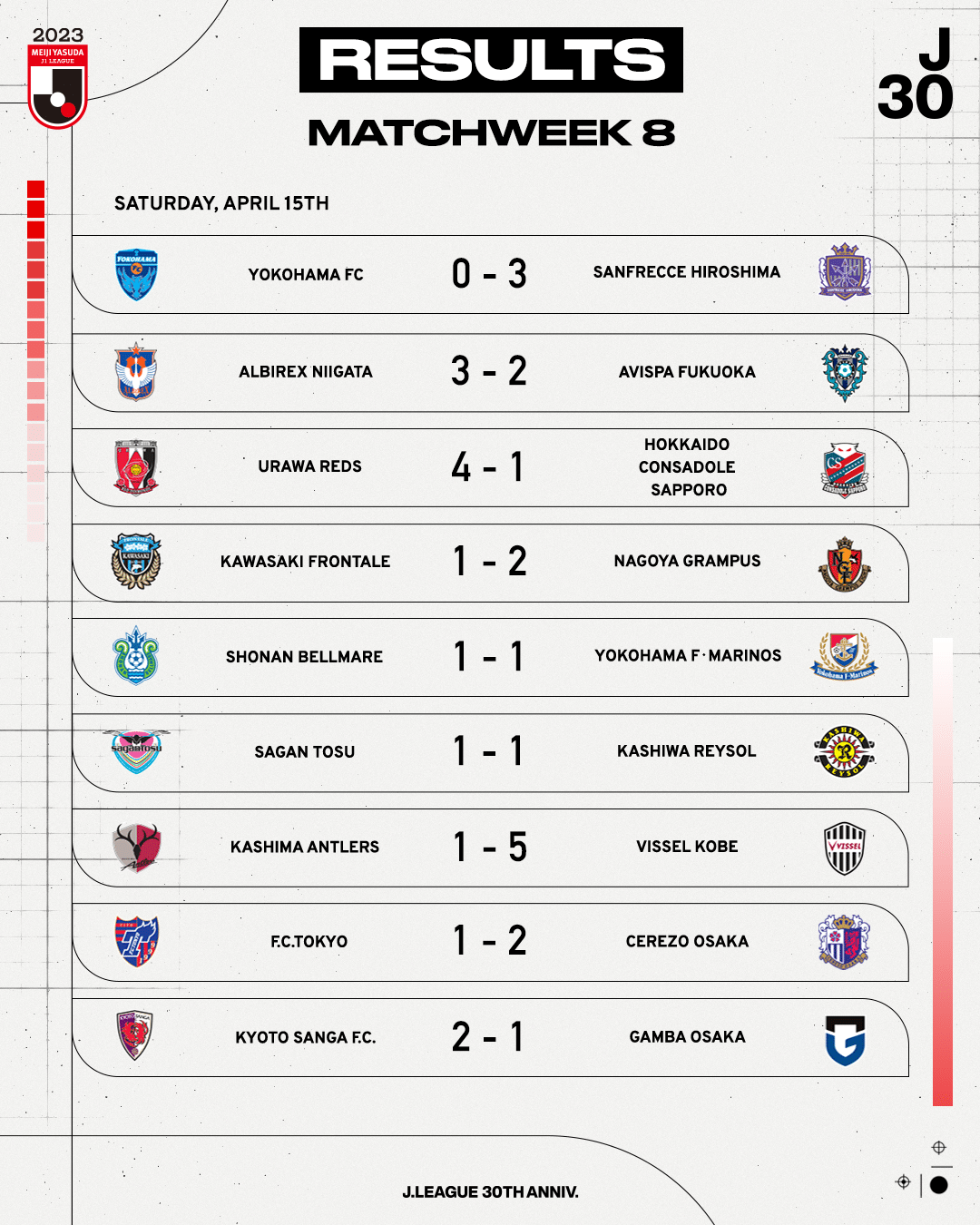 สรุปผลการแข่งขัน เจลีก ญี่ปุ่น 2023 หลังจบนัดที่ 8 (อัปเดตวันที่ 17 เมษายน 2566)