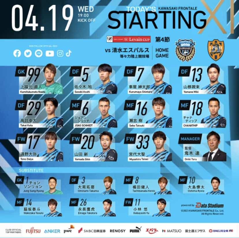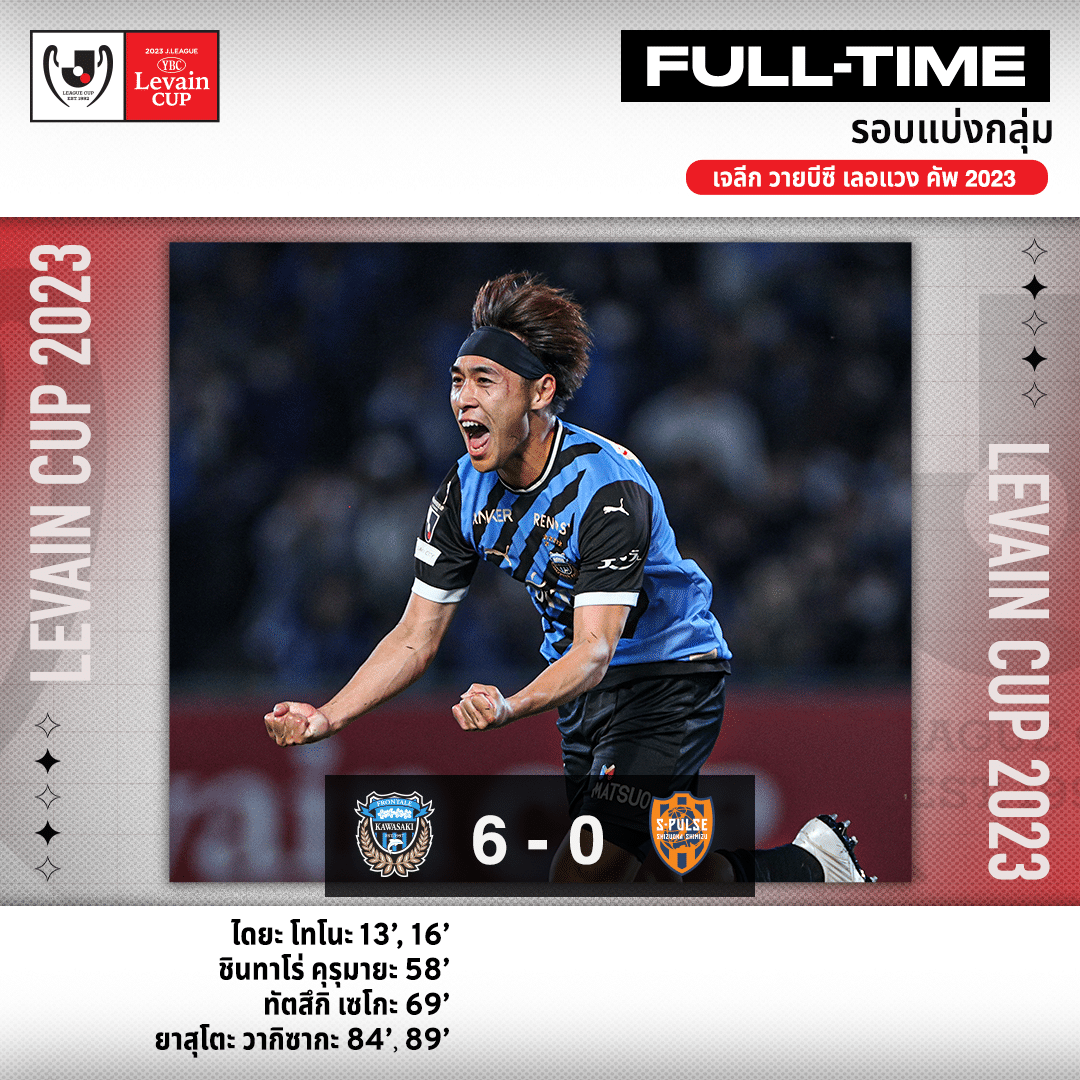 รายงานผลการแข่งขัน ฟุตบอล ลูวานคัพ ฟุตบอลถ้วยใหญ่ของ ญี่ปุ่น ซึ่งเป็นรอบแบ่งกลุ่มประจำวันพุธที่ 19 เมษายน 2566 ที่สนามโทโดโรกิ สเตเดี้ยม ระหว่าง คาวาซากิ ฟรอนตาเล่ พบ ชิมิสึ เอส-พัลส์ จากเจทู โดยเกมนี้ เจ้าบ้าน ฟรอนตาเล่ของ โทรุ โอนิกิ ส่ง ชนาธิป สรงกระสินธ์ มิดฟิลด์ทีมชาติไทยออกสตาร์ตเป็นตัวจริงปั้นเกมอยู่ด้านหลัง ไทเซ มิยาชิโระ