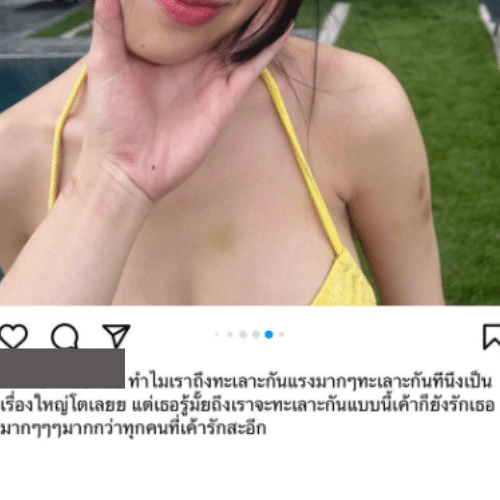 ทั้งนี้คนสนิทของผู้หญิงที่ถูกทำร้าย ยังได้โพสต์ภาพจากไอจีของ ต. ซึ่งได้ถ่ายรูปแฟนสาวมาลง โดยมีคนสังเกตเห็นรอยช้ำบริเวณต้นแขน พร้อมแคปชั่นว่า “ทำไมเราถึงทะเลาะกันแรงมาก ๆ ทะเลาะกันทีนึงเป็นเรื่องใหญ่โตเลย แต่เธอรู้มั้ยถึงจะทะเลาะกันแบบนี้เค้าก็ยังรักเธอมากๆๆๆมากกว่าทุกคนที่เค้ารักสะอีก”
