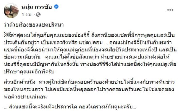 ล่าสุดผมได้คุยกับคุณแม่ของน้องจีจี้ ถึงกรณีของแชตที่มีการพูดคุยและเป็นประเด็นกันอยู่ว่า เป็นแชตจริงหรือ แชตปลอม … คุณแม่น้องจีจี้ยืนยันกับผมว่า แชตนี้น้องจีจี้เคยนำมาให้คุณแม่ดูก่อนที่น้องจะเสียชีวิตประมาณหนึ่งปี และเป็นข้อความเดียวกัน คุณแม่ได้ตั้งข้อสังเกตุว่า ฝ่ายชายน่าจะแคปแล้วส่งต่อให้น้องจีจี้ดูตอนมีปัญหากันในครั้งนั้น ทางน้องจีจี้จึงได้นำแชตนี้ส่งให้คุณแม่ดูเพื่อปรึกษาคุณแม่อีกทีครับ