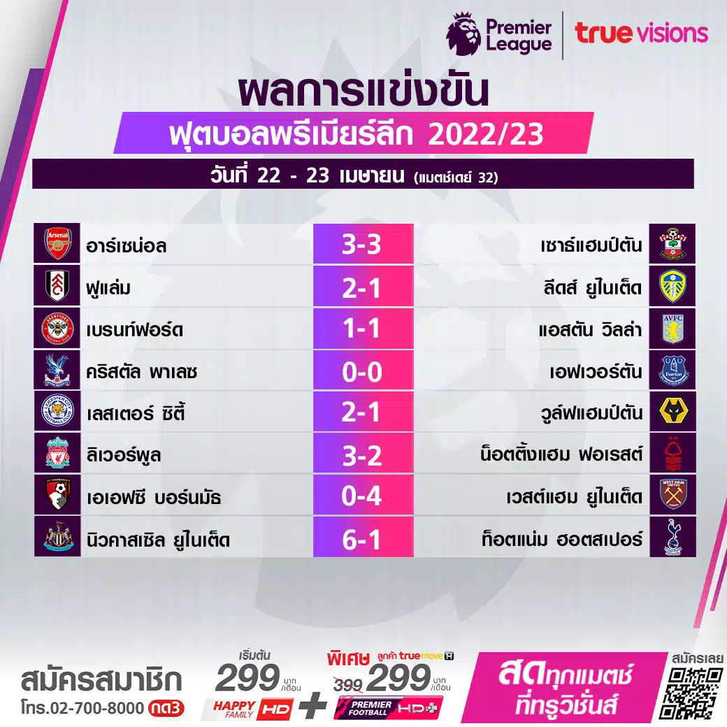 สรุปผล พรีเมียร์ลีก 2022/23 ล่าสุด ประจำสัปดาห์ที่ 32 (ข้อมูลล่าสุดวันที่ 24 เม.ย. 66)