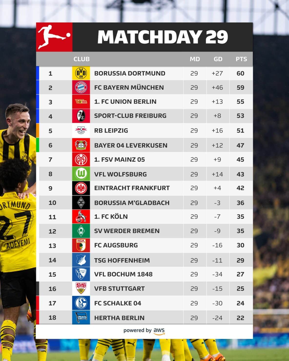 อันดับ ตารางคะแนน บุนเดสลีกา เยอรมัน 2022/2023 หลังจบแมตซ์เดย์ที่29 โดย 5 อันดับเป็นไปตามลำดับมีดังนี้