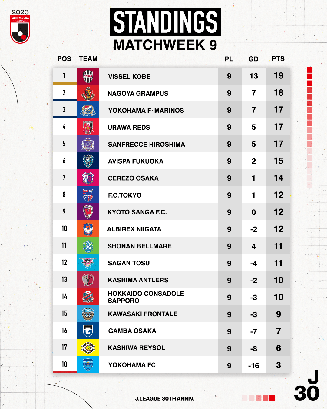 อันดับ ตารางคะแนน เจลีก ญี่ปุ่น 2023 หลังจบแมตซ์เดย์ที่ 9 โดย 5 อันดับเป็นไปตามลำดับมีดังนี้