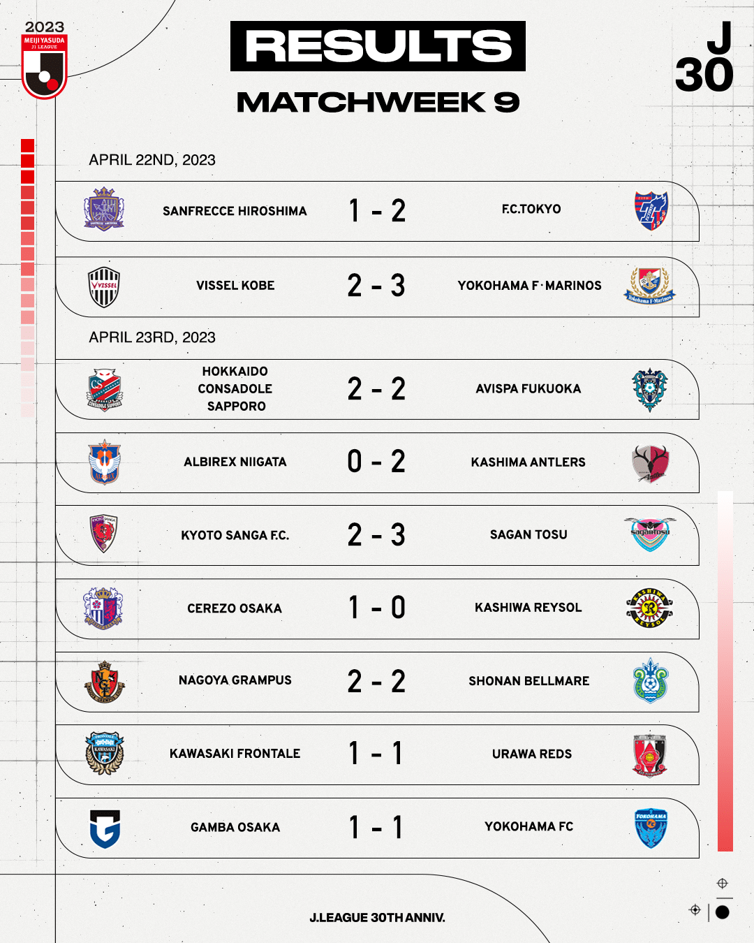 สรุปผลการแข่งขัน เจลีก ญี่ปุ่น 2023 หลังจบนัดที่ 9 (อัปเดตวันที่ 23 เมษายน 2566)