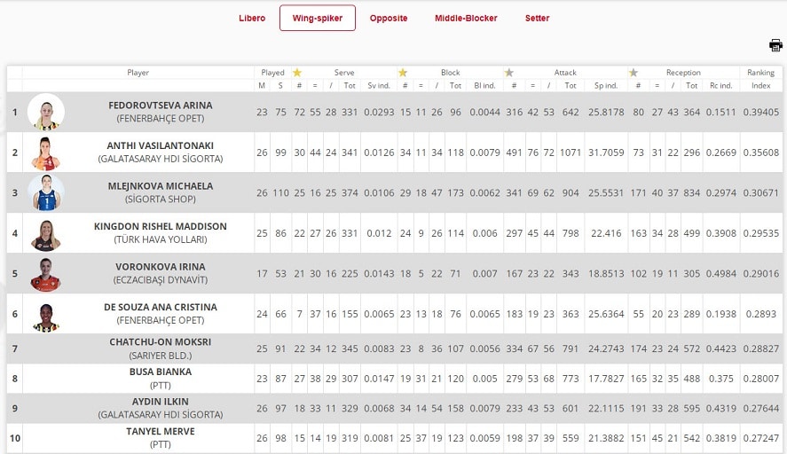 เทียบชั้นกับหัวเสาแถวหน้าของโลก อันดับ 1 ได้แก่ อรินา เฟดโดโรเซว่า จากรัสเซีย สังกัดทีมเฟเนบาห์เช อันดับ 2 แอนธิ วาสิแลนโทนากิ ทีมกาลาตาซาราย อันดับ 3 มิเชลล่า เมจโคว่า อันดับ 4 เมดิสัน คิงดอน จากสหรัฐอเมริกา และอันดับ 5 อิริน่า โวรอนโคว่า จากรัสเซีย