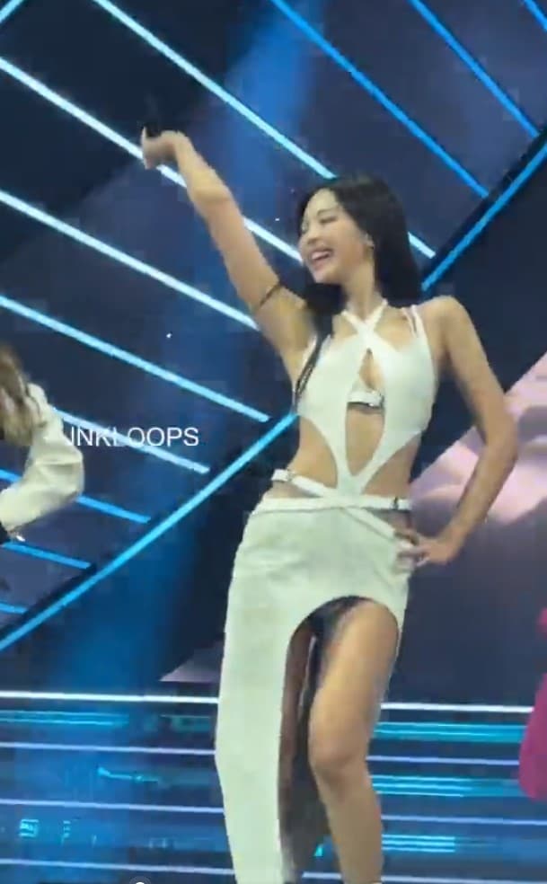 ทั้งนี้อีกชุดที่ใส่ในการแสดงอย่างชุดกระโปรงสีขาว ก็เป็นที่พูดถึงไม่แพ้กัน โดยชุดสีขาวเป็นกระโปรงที่ด้านหนึ่งยาว ในขณะที่อีกด้านถูกตัดขึ้นมานถึงบริเวณขาอ่อน แถมด้านบนของชุดนี้ ยังโชว์ความเซ็กซี่แบบจัดเต็ม ด้วยการเปิดหน้าท้องโชว์เอวหวานและแผ่นหลัง ทั้งยังมีการใส่ลูกเล่นด้วยการเพิ่มดีเทลผ้าไขว้เข้าหากันบริเวณหน้าอกอีกด้วย