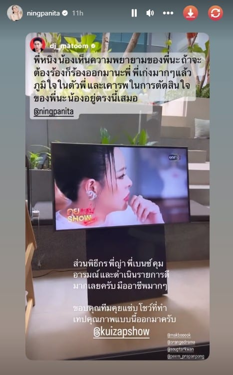 เชื่อเลยว่านอกจากจะได้กำลังใจจากน้องณิริน สาวหนิงก็ยังได้กำลังใจเต็มเปี่ยมจากเหล่าเพื่อนดาราในวการบันเทิง เพราะหลังจากที่ได้รับฟังการเปิดใจพูดคุยของหนิงในรายการ ทุกคนต่างก็ส่งกำลังใจมาอย่างท่วมท้น ไม่ว่าจะเป็นรุ่นพี่คนสนิทอย่าง บิ๊ก ศรุต วิจิตรานนท์ ซึ่งเป็นอดีตคนรู้ใจของสาวหนิงด้วย