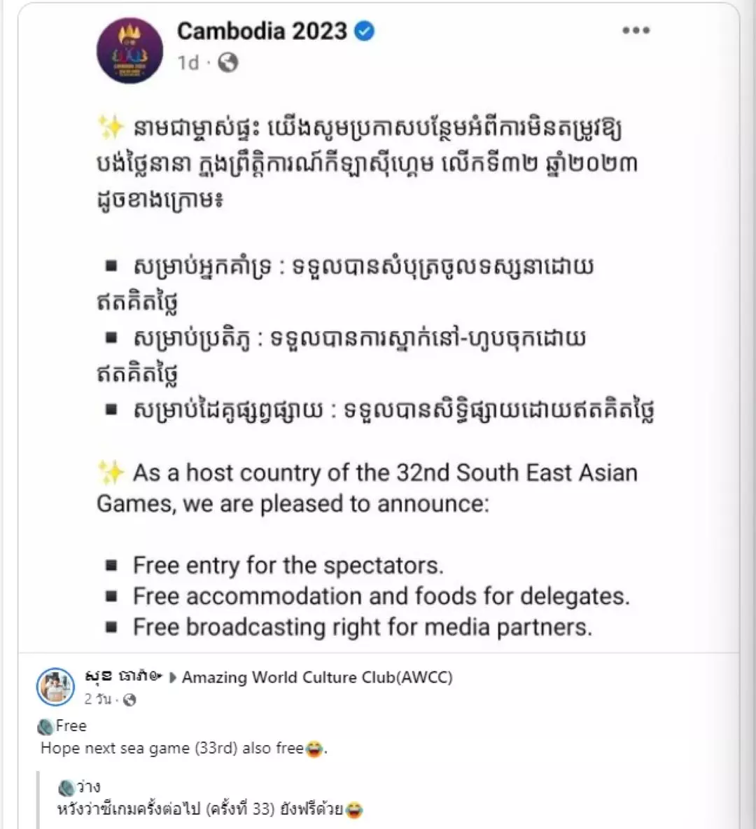 หลังจากนั้นไม่นาน มีแฟนกีฬาชาวเขมรรายหนึ่งได้นำโพสต์ดังกล่าวไปแชร์ในกลุ่ม Amazing World Culture Club (AWCC) พร้อมแคปชั่นสั้นๆว่า “ฟรี หวังว่าซีเกมส์ครั้งต่อไป ยังฟรีด้วย”