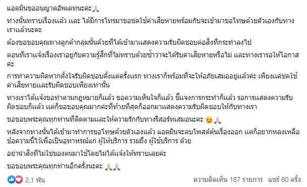 หลังจากที่ทางรีสอร์ต ปล่อยให้คณะทัวร์ เดินทางไปลงที่ครูโรงเรียนดังกล่าวมาทั้งคืน ในเช้าวันถัดมา 26 เมษายน 2566 เพจก็ได้ออกมาแจ้งว่าตอนนี้ ทางคณะครูได้มีการขอชดใช้ค่าเสียหาย และจะเดินทางมาขอโทษด้วยเองกับทางรีสอร์ตแล้ว ซึ่งทางเพจจะทำการลโพสต์ต้นเรื่องออกให้