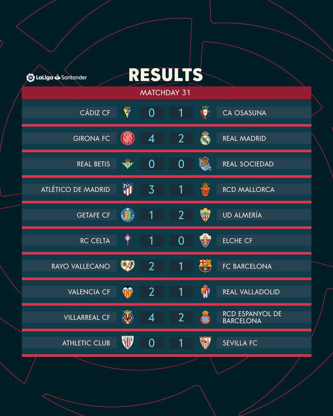 สรุปผลการแข่งขัน ลาลีกา สเปน หลังจบสัปดาห์ที่ 31