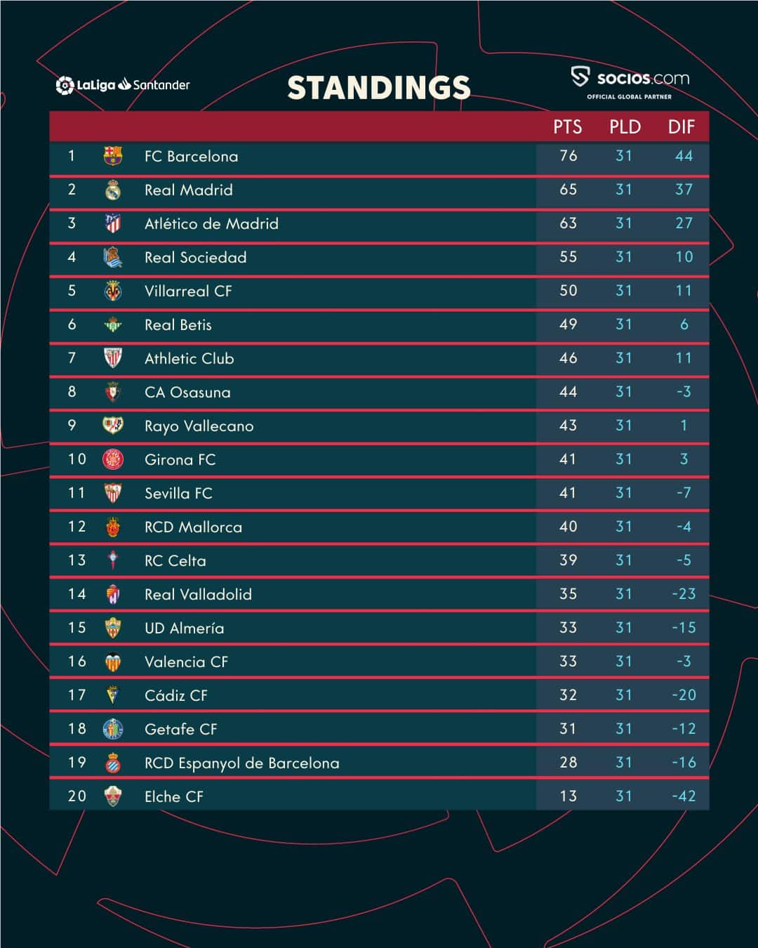 อันดับตารางคะแนน ลาลีกา สเปน 2022/2023 หลังจบนัดที่31 โดย 5 อันดับแรกในตารางเป็นไปตามลำดับมีดังนี้
