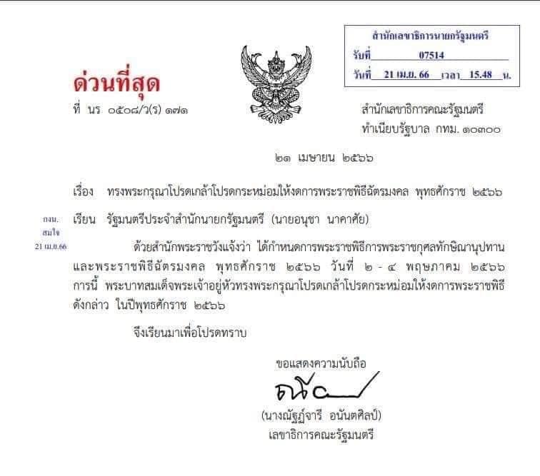 ขณะที่ หนังสือสำนักเลขาธิการคณะรัฐมนตรี ระบุว่า “เรื่อง ทรงพระกรุณาโปรดเกล้าโปรดกระหม่อมให้งดการพระราชพิธีฉัตรมงคล พุทธศักราช 2566 เรียน รัฐมนตรีประจำสำนักนายกรัฐมนตรี (นายอนุชา นาคาศัย)