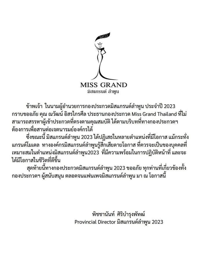 “ข้าพเจ้า ในนามผู้อำนวยการกองประกวดมิสแกรนด์ลำพูน ประจำปี 2023 กราบขออภัย คุณ ณวัฒน์ อิสรไกรศีล ประธานกองประกวด Miss Grand Thailand ที่ไม่สามารถสรรหาผู้เข้าประกวดที่ตรงตามคุณสมบัติได้ตามบริบทที่ทางกองประกวดฯ ต้องการเพื่อสานต่อเจตนารมณ์องค์กรได้