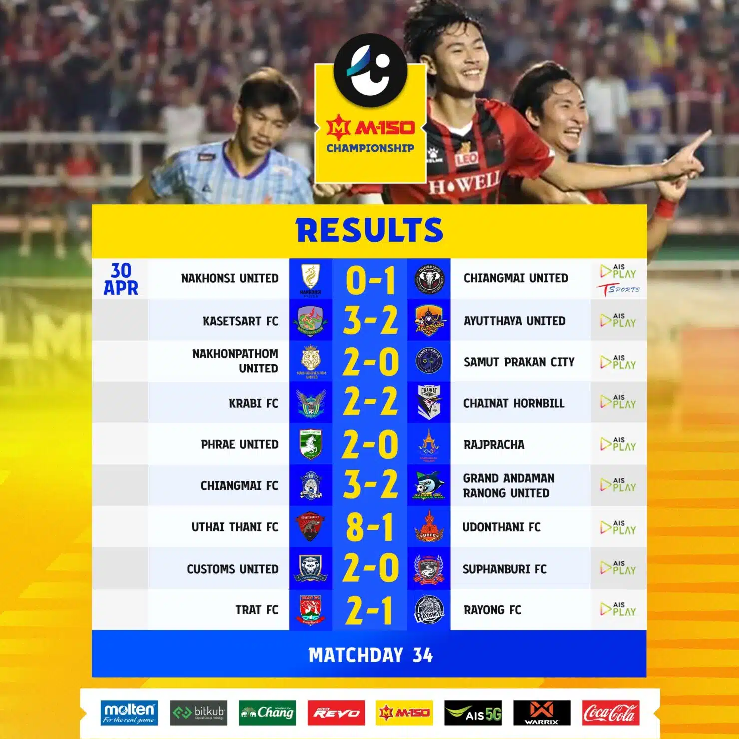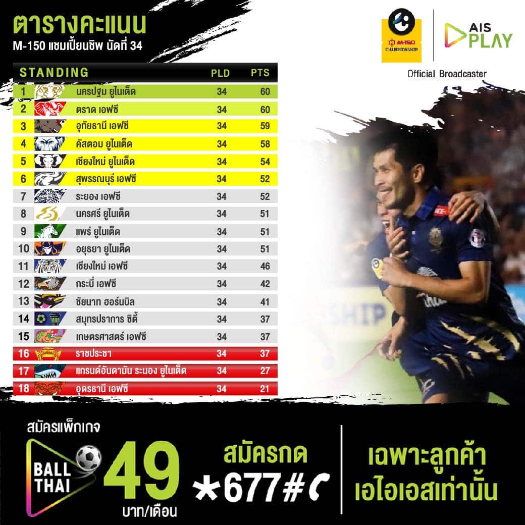 สถานการณ์ ตารางคะแนน ล่าสุด นครปฐม ยูไนเต็ด คว้าแชมป์ ไทยลีก2 M-150 แชมเปี้ยนชิพ เป็นผลสำเร็จ หลังมี 60 คะแนนเท่ากับ ตราด เอฟซี แต่นครปฐม ยูไนเต็ด มีเฮดทูเฮดที่ดีกว่า ส่วนอันดับสามเป็นของ อุทัยธานี เอฟซี ที่มี 59 คะแนน
