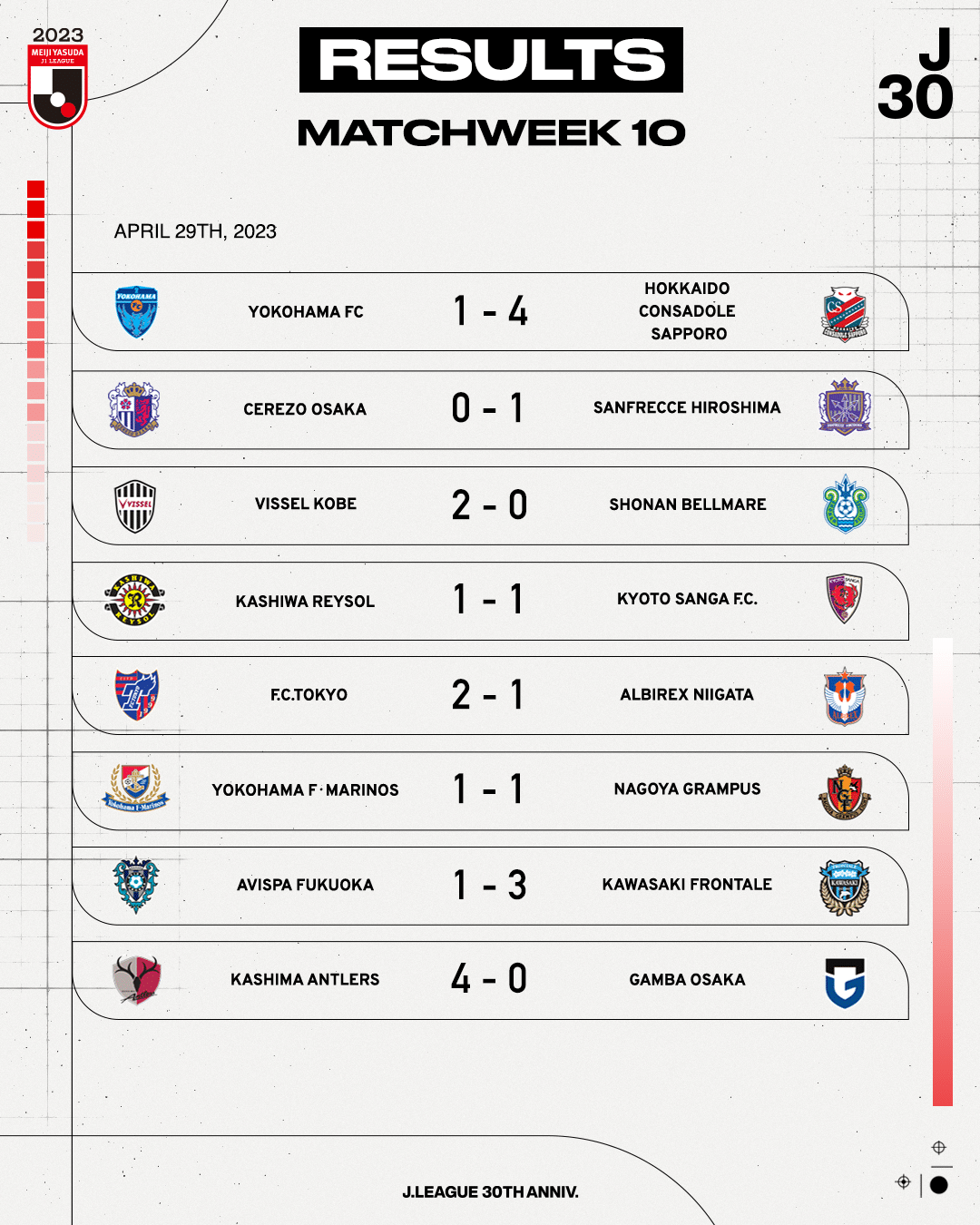 สรุปผลการแข่งขัน เจลีก ญี่ปุ่น 2023 หลังจบนัดที่ 10 (อัปเดตวันที่ 5 พฤษภาคม 2566)