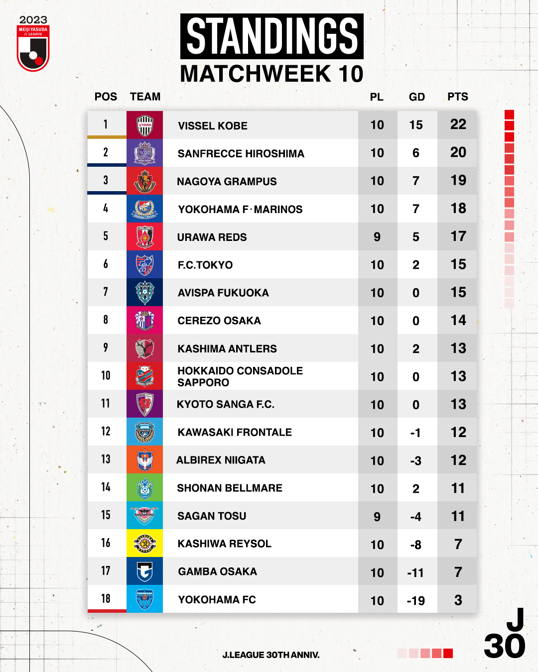 อันดับ ตารางคะแนน เจลีก ญี่ปุ่น 2023 หลังจบแมตซ์เดย์ที่ 10 โดย 5 อันดับเป็นไปตามลำดับมีดังนี้