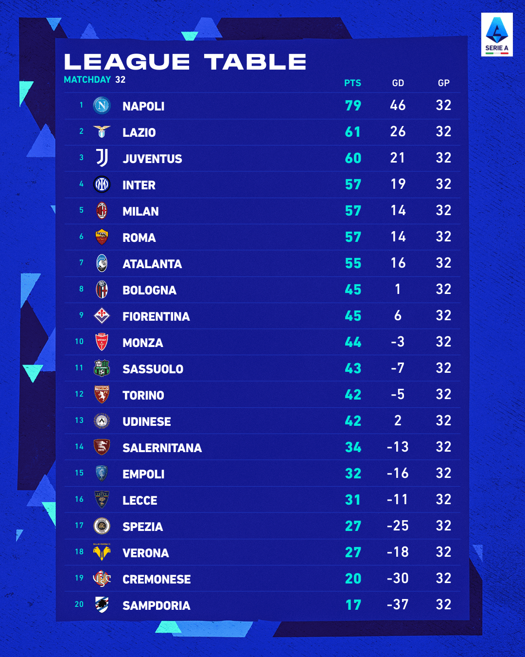 สถานการณ์ ตารางคะแนน ล่าสุด ของศึก กัลโช่ เซเรียอา หลังจบสัปดาห์ที่ 32 นั้น นาโปลี อดฉลองแชมป์อย่างน่าเสียดายเมื่อเก็บได้เพียงแต้มเดียว มีเพิ่มเป็น 79 คะแนน ต้องรอเฮนัดหน้า ส่วน ลาซิโอ รั้งอันดับสองจากการมี 61 คะแนน ด้านม้าลาย ยูเวนตุส ขยับมารั้งอยู่ที่สาม มี 60 คะแนน ส่วน อินเตอร์, โรม่า และ เอซี มิลาน อยู่อันดับ 4,5 และ 6 หลังมี 57 คะแนน เท่ากัน