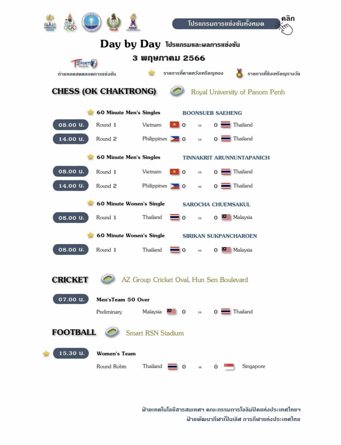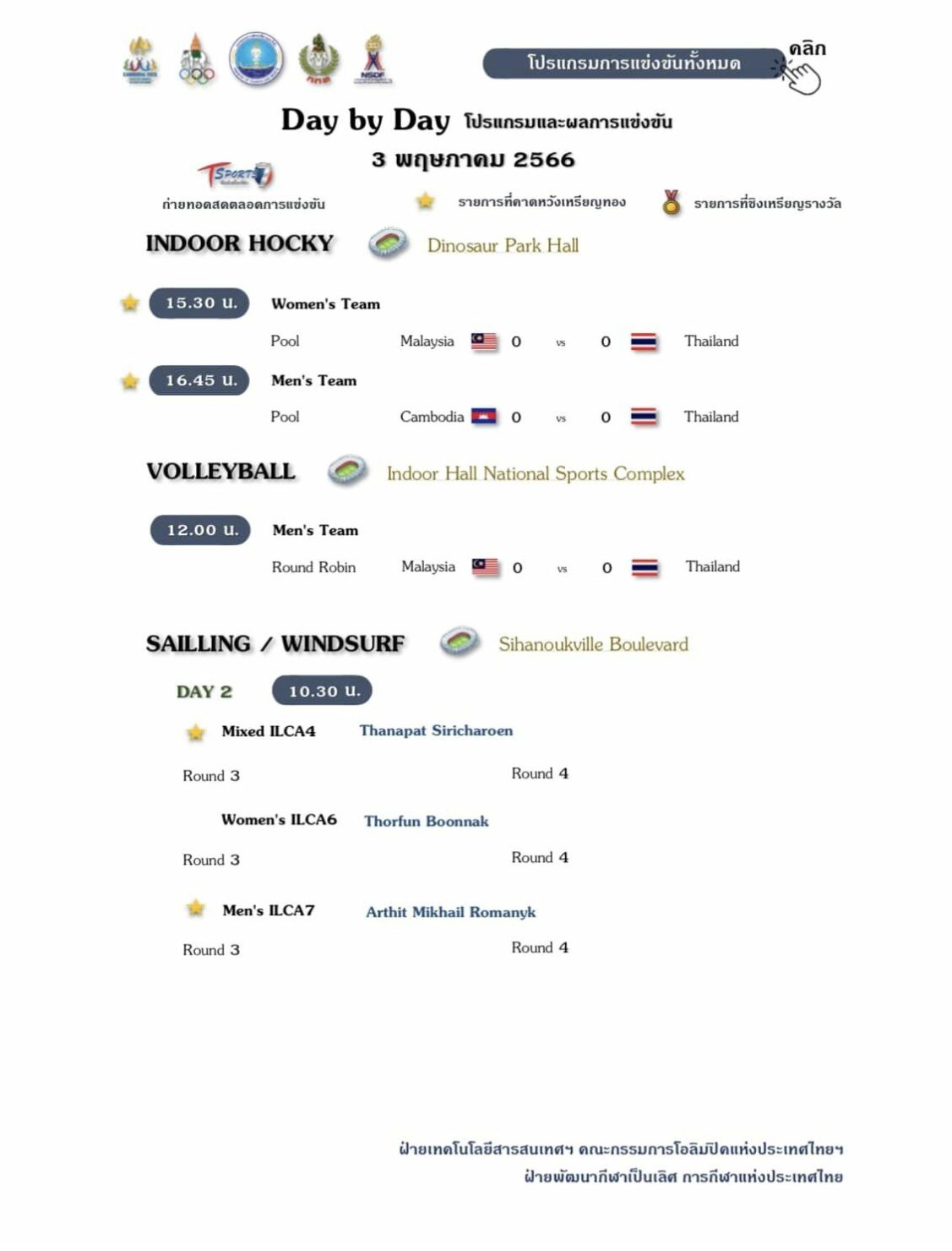 โปรแกรมแข่งขันซีเกมส์ประจำวันที่ 3 พฤษภาคม 2566 ได้แก่