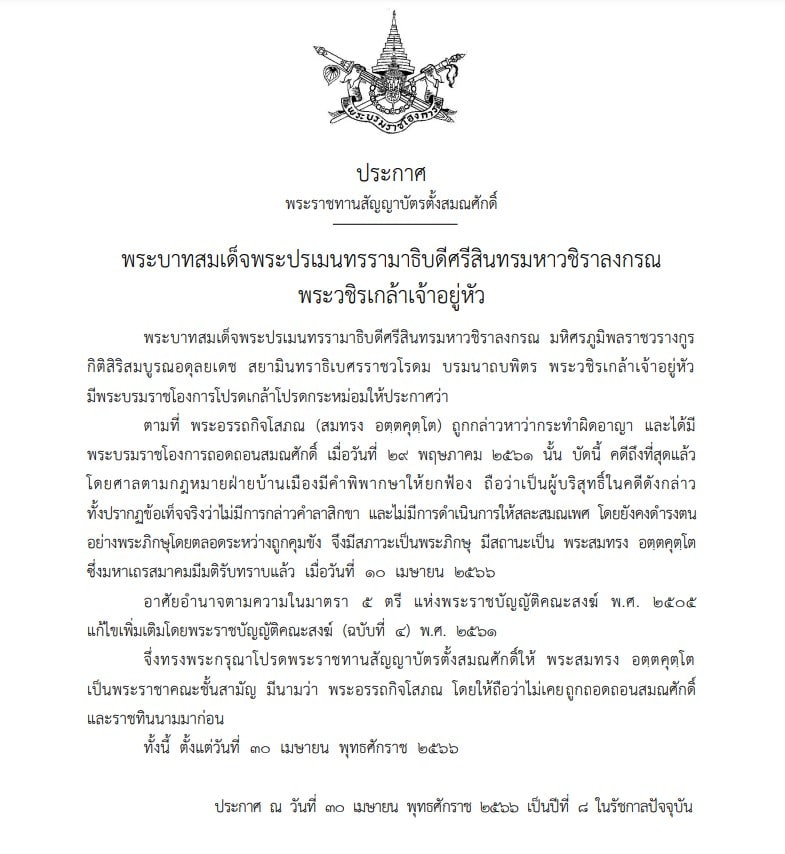 วันที่ 3 พฤษภาคม 2566 มีรายงานจาก เว็บไซต์ราชกิจจานุเบกษา เผยแพร่ พระบรมราชโองการ ประกาศพระราชทานสัญญาบัตรตั้งสมณศักดิ์ ใจความว่า พระบาทสมเด็จพระปรเมนทรรามาธิบดีศรีสินทรมหาวชิราลงกรณ มหิศรภูมิพลราชวรางกูร กิติสิริสมบูรณอดุลยเตซ สยามินทราธิเบศรราชวโรดม บรมนาถบพิตร พระวชิรเกล้าเจ้าอยู่หัว มีพระบรมราชโองการโปรดเกล้าโปรดกระหม่อมให้ประกาศว่า