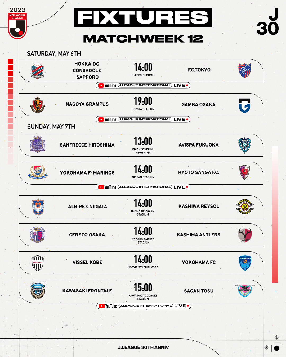 ตารางแข่งขัน เจลีก ญี่ปุ่น 2023 โปรแกรมฟุตบอล เจลีก สัปดาห์ที่ 12