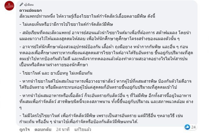 ล่าสุดเพจ ดาวแปดแฉก ได้โพสต์ข้อความเฟซบุ๊กอิงสัตวแพทย์ ตอบคำถามว่าไซยาไนด์ไล่ตัวเงินตัวทองหรือไล่งูได้จริงหรือไม่ โดยระบุว่า “– ไม่เคยเห็นหรือว่ามีการใช้ไซยาไนด์กำจัดสัตว์มีพิษ
