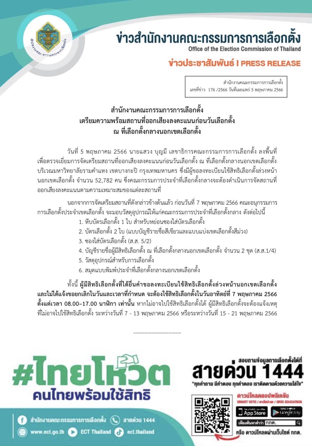 ทั้งนี้ หลังปิดหีบบัตรลงคะแนนเลือกตั้ง 2566 ในช่วงเวลา 17.00 น. ทางเจ้าหน้าที่ กปน. และเจ้าหน้าที่ที่เกี่ยวข้องกับการรักษาความปลอดภัยจะลำเลียงบัตรเลือกตั้งไปที่บริษัทไปรษณีย์ไทย เพื่อคัดแยกบัตรก่อนที่จะส่งไปยังภูมิลำเนาของผู้มีสิทธิเลือกตั้ง โดยประชาชนที่ต้องการออกไปใช้สิทธิออกเสียง สามารถเตรียมปากกาไว้กาบัตรได้ทุกสี แต่ กกต.แนะนำให้ใช้สีน้ำเงินเนื่องจากการใช้สีอื่นอาจจะมีนัยยะแฝงในทางการเมือง.
