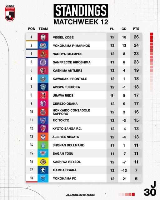 อันดับ ตารางคะแนน เจลีก ญี่ปุ่น 2023 หลังจบแมตซ์เดย์ที่ 12 โดย 5 อันดับเป็นไปตามลำดับมีดังนี้