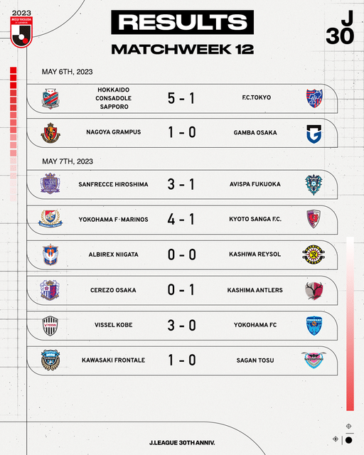 สรุปผลการแข่งขัน เจลีก ญี่ปุ่น 2023 หลังจบนัดที่ 12 (อัปเดตวันที่ 8 พฤษภาคม 2566)