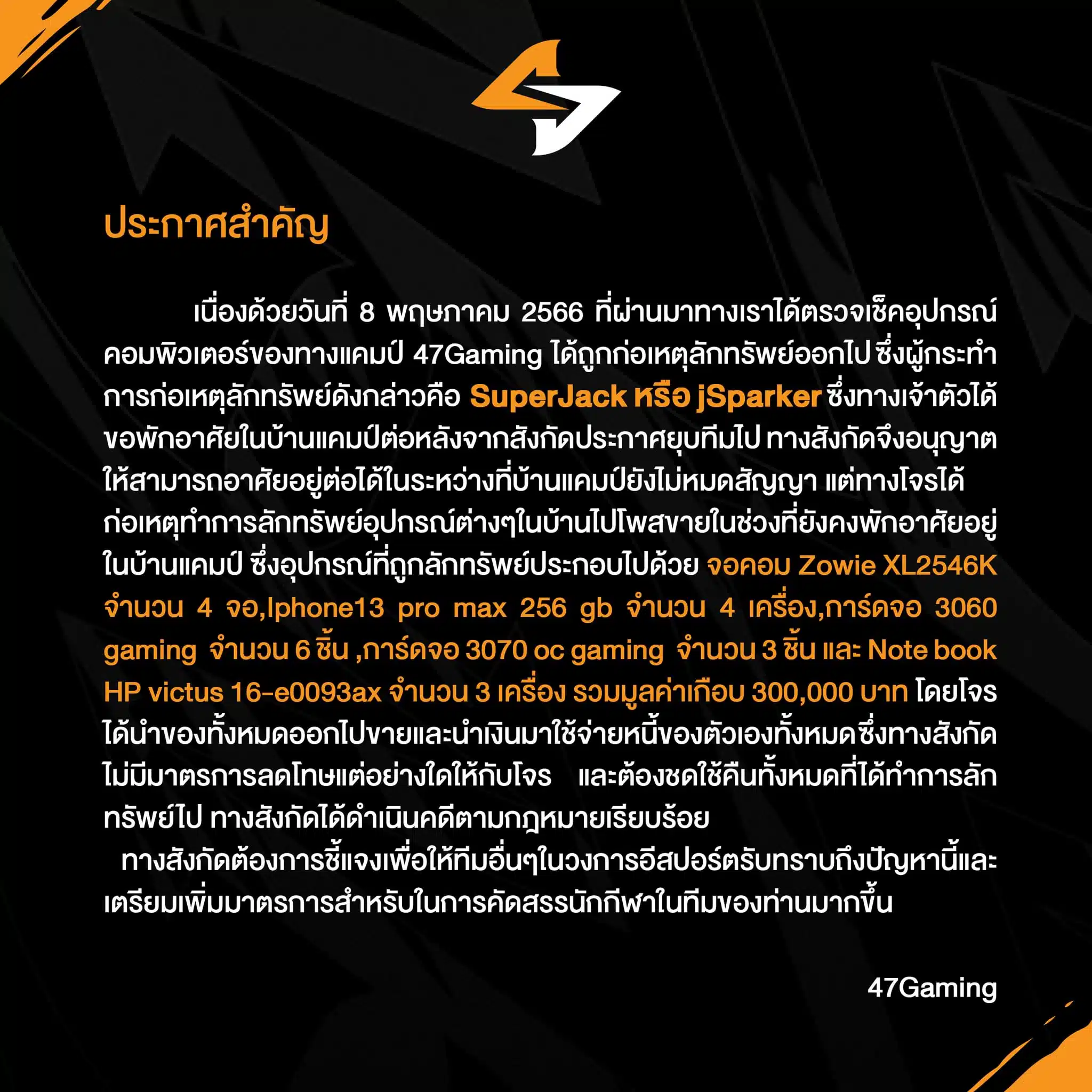 วันนี้ 9 พฤษภาคม 2566 เกิดข่าวใหญ่สะเทือนวงการเกมอีสปอร์ต หลังล่าสุด 47Gaming บ้านแคมป์ ต้นสังกัดกีฬา E-Sport ชื่อดัง ร่อนแถลงการหลังโดนอดีตนักกีฬาในสังกัดอย่าง ทรงพล ไพเชียรพัฒน์ ฉายา SuperJack หรือ jSparker ลักทรัพย์ ขโมยของในบ้านไปมูลค่ากว่า 3 แสนบาท