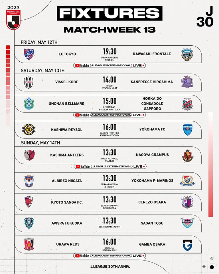 ตารางแข่งขัน เจลีก ญี่ปุ่น 2023 สัปดาห์ที่ 13 แข่งวันที่ 12-14 พฤษภาคม นี้ เช็กโปรแกรมแข่ง ตารางการแข่งขัน ฟุตบอลรายการอันดับหนึ่งของลีกญี่ปุ่น เช็กช่องถ่ายทอดสดทาง Youtube Siamsport ช่องทางดูบอลออนไลน์ได้ ที่นี่