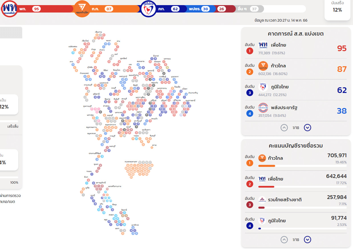 ติดตามผลการเลือกตั้ง คาดการณ์ สส แบ่งเขต 400 ที่นั่ง Thaiger เช็คผลเลือกตั้งแบบเรียลไทม์ จากข้อมูลการนับคะแนนเลือกตั้งจากเว็บไซต์ คณะกรรมการการเลือกตั้ง ectreport.com/overview ที่อยู่ระหว่างการนับผลคะแนน ข้อมูล ณ วันที่ 14 พฤษภาคม 2566