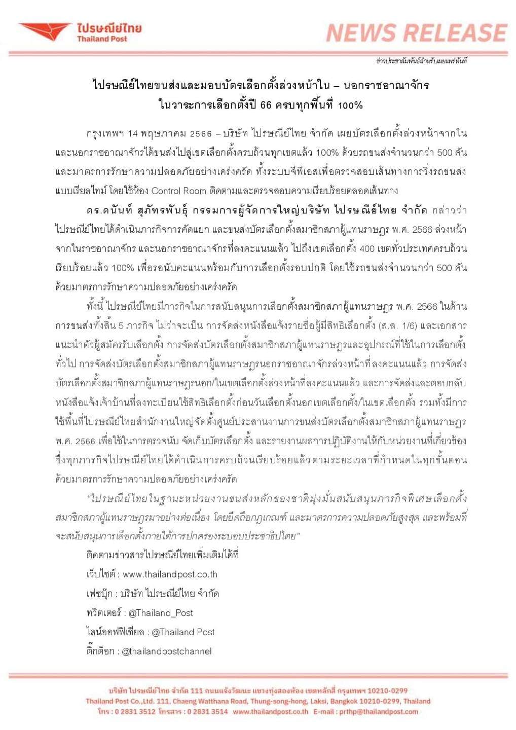 ดร.ดนันท์ สุภัทรพันธุ์ กรรมการผู้จัดการใหญ่บริษัท ไปรษณีย์ไทย จำกัด กล่าวว่า ไปรษณีย์ไทยได้ดำเนินภารกิจการคัดแยก และขนส่งบัตรเลือกตั้งสมาชิกสภาผู้แทนราษฎร พ.ศ. 2566 ล่วงหน้าจากในราชอาณาจักร และนอกราชอาณาจักรที่ลงคะแนนแล้ว ไปถึงเขตเลือกตั้ง 400 เขตทั่วประเทศครบถ้วนเรียบร้อยแล้ว 100% เพื่อรอนับคะแนนพร้อมกับการเลือกตั้งรอบปกติ โดยใช้รถขนส่งจำนวนกว่า 500 คัน ด้วยมาตรการรักษาความปลอดภัยอย่างเคร่งครัด