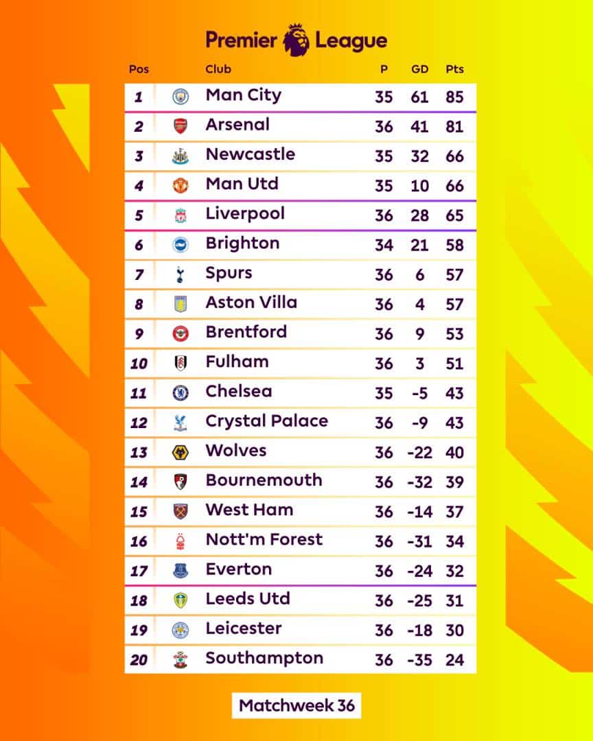 สรุปผล พรีเมียร์ลีก 2022/23 ล่าสุด ประจำสัปดาห์ที่ 36 (ข้อมูลล่าสุดวันที่ 16 พ.ค. 66)