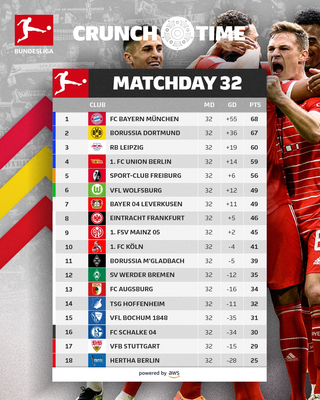 อันดับ ตารางคะแนน บุนเดสลีกา เยอรมัน 2022/2023 หลังจบแมตซ์เดย์ที่ 32 โดย 5 อันดับเป็นไปตามลำดับมีดังนี้