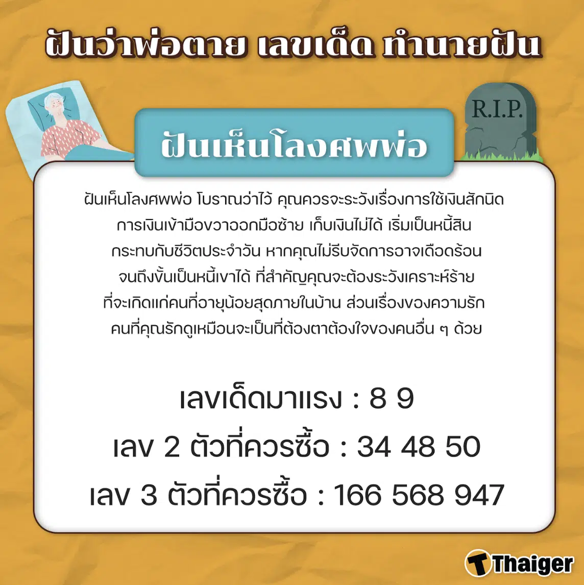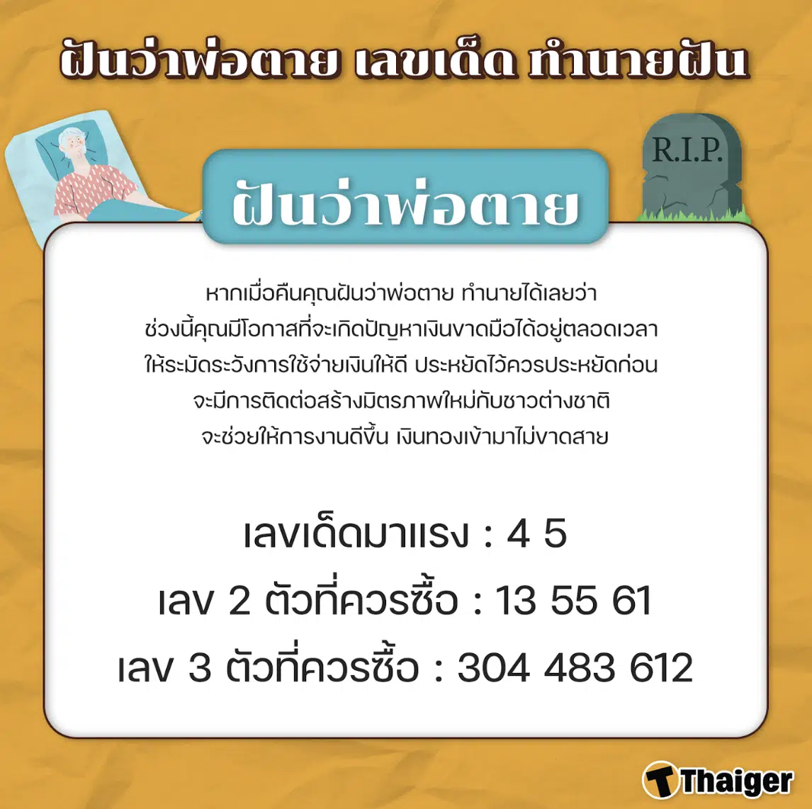 หากเมื่อคืนคุณ ฝันว่าพ่อตาย ทำนายได้เลยว่า ช่วงนี้คุณมีโอกาสที่จะเกิดปัญหาเงินขาดมือได้อยู่ตลอดเวลา ให้ระมัดระวังการใช้จ่ายเงินให้ดี ประหยัดไว้ควรประหยัดก่อน จะมีการติดต่อสร้างมิตรภาพใหม่กับชาวต่างชาติ จะช่วยให้การงานดีขึ้น เงินทองเข้ามาไม่ขาดสาย สำหรับคนที่ทำอาชีพค้าขาย ทำกิจการส่วนตัว จะเป็นเดือนที่กำไรงาม มีเกณฑ์ได้ขยับขยายกิจการ เรื่องความรัก คนมีคู่เตรียมเข้าประตูวิวาห์สายฟ้าแล่บได้เลย เพราะความสัมพันธ์ของคุณทั้งสองคนกำลังเป็นไปได้ด้วยดี มีแต่ความสุขเข้ามา