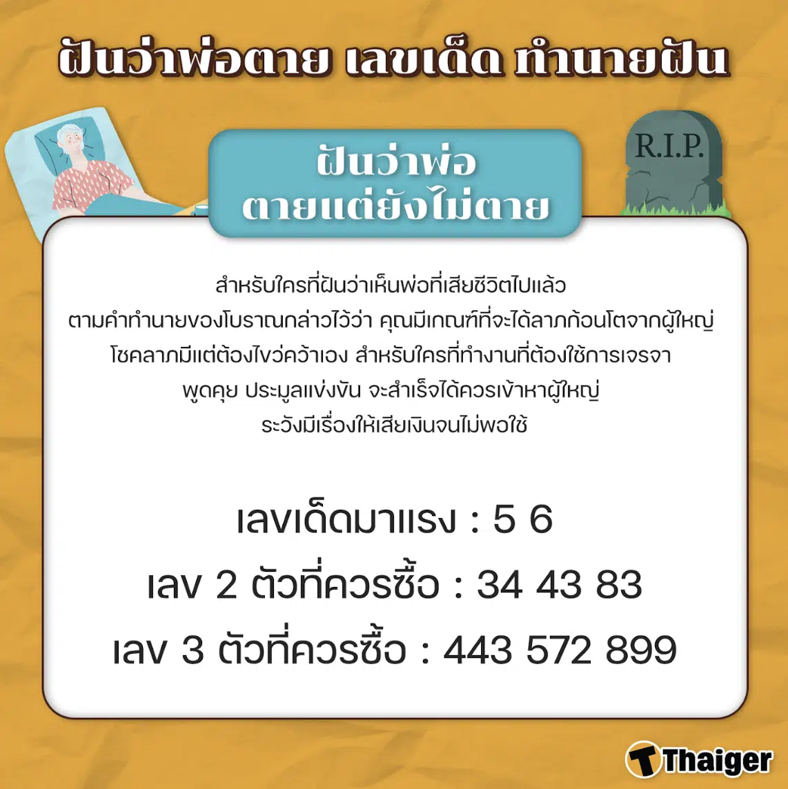 - ฝันว่าพ่อตายแต่ยังไม่ตาย เลขเด็ดมาแรง : 5 6