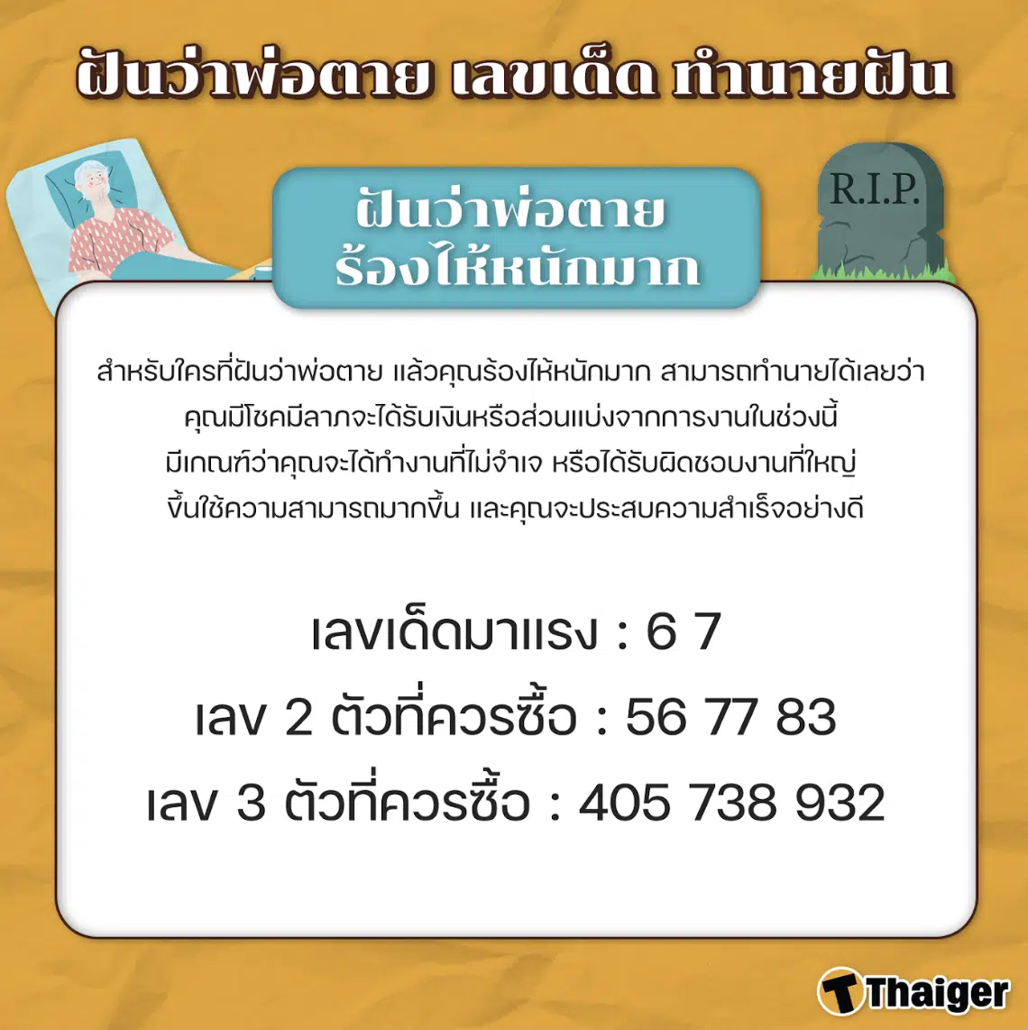 - ฝันว่าพ่อตาย ร้องไห้หนักมาก เลขเด็ดมาแรง : 6 7