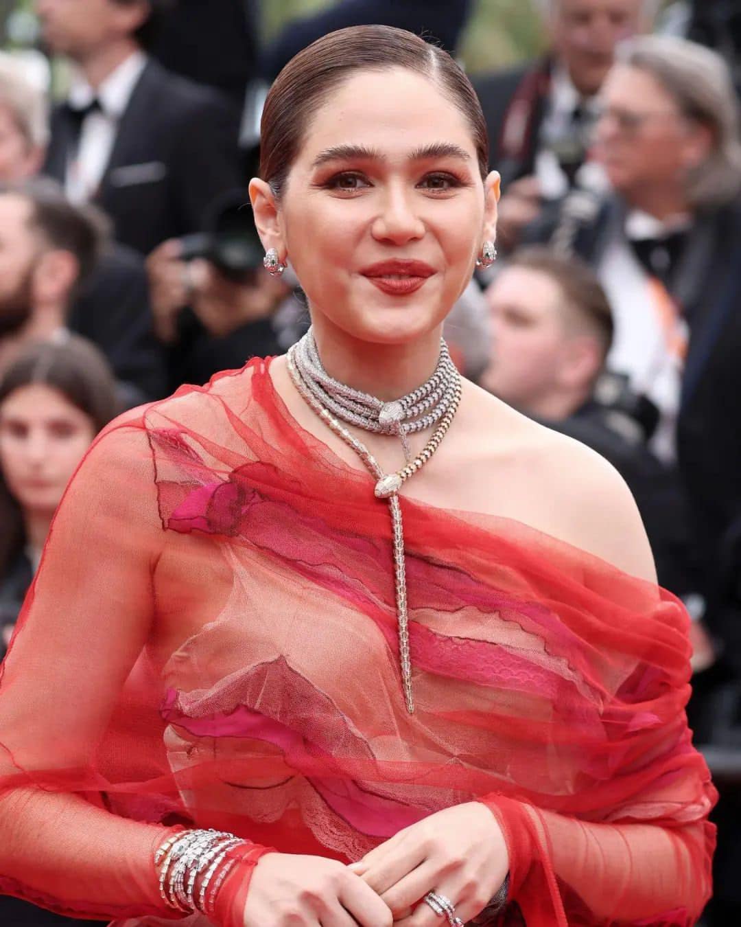 สำหรับชุดของชมพู่ ด้านนอกเป็นผ้าซีทรูสีแดงสด เผยให้เห็นลวดลายด้านในที่มีการสวมใส่ผ้าสีเนื้อ สีชมพู ประดับลายลูกไม้สีดำ อีกทั้งยังสวมใส่เครื่องประดับเป็นสร้อยมุก และสร้อยรูปงูประดับเพชรไว้บนคอ สะท้อนให้เห็นความหรูหราจากแบรนด์ Bulgari ทั้งยังสวมใส่กำไลข้อมือและแหวนจากแบรนด์เดียวกันอีกด้วย