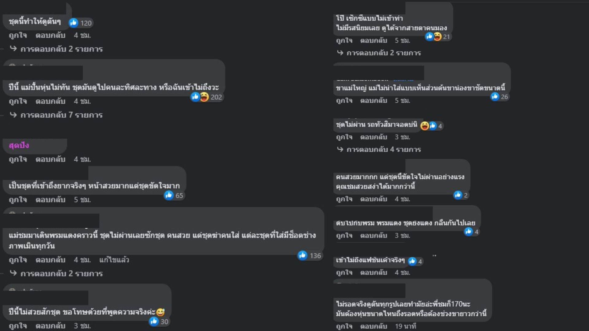 สำหรับชาวเน็ตที่ไม่ชอบชุดเดินพรมแดงเมืองคานส์ของชมพู่ ได้ร่วมกันแสดงความคิดเห็นไว้อย่างคึกคัก อาทิ “ปีนี้ แม่ปั้นหุ่นไม่ทัน ชุดมันดูไปคนละทิศละทาง หรือฉันเข้าไม่ถึงวะ”, “เป็นชุดที่เข้าถึงยากจริงๆ หน้าสวยมากแต่ชุดขัดใจมาก”, “แม่ชมมาเดินพรมแดงคราวนี้ ชุดไม่ผ่านเลยซักชุด คนสวย แต่ชุดฆ่าคนใส่ แต่ละชุดที่ใส่มีช็อตช่างภาพเมินทุกวัน”, “แม่ไม่ควรโชว์ต้นขา ต้องฟิตหุ่นหน่อยค่ะ” และ “คนสวย แต่ชุดฆ่าคนใส่”