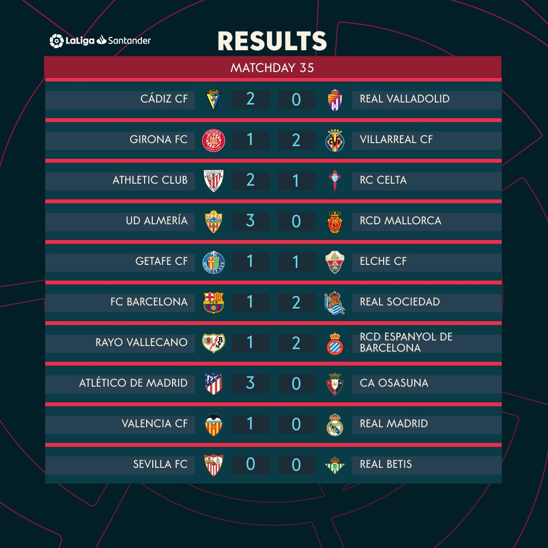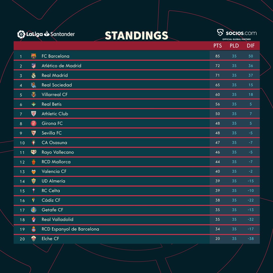 ทำให้สถานการณ์ตารางคะแนนล่าสุดของศึก ลาลีกา นั้น บาร์เซโลน่า การันตีแชมป์ไปแล้ว ด้วยการมี 85 คะแนน และเหลือการเล่นเพียง 3 นัด ด้านรองฝูงกลับเป็น แอต.มาดริด ที่แซง เรอัล มาดริด ขึ้นมาเป็นที่สองแล้วหลังมี 72 คะแนน ด้าน แชมป์เก่า ที่ไม่มีแต้มในสัปดาห์นี้ตกลงไปรั้งที่สามมี 71 คะแนนเท่าเดิม