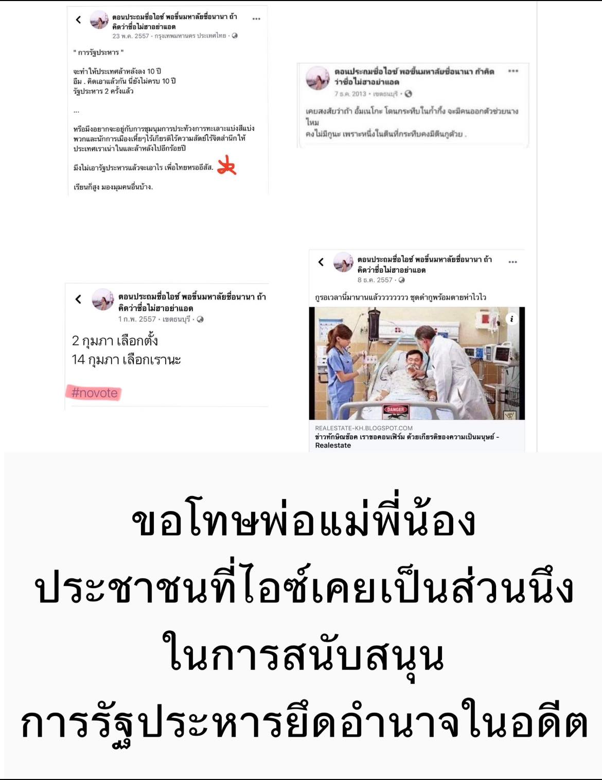 ไอซ์ขอยอมรับความผิดพลาดและต้องขอโทษทุกคน จากในจริง ขอโทษคุณอั้ม เนโกะ ขอโทษคุณทักษิณ ขอโทษอาจารย์สมศักดิ์ และคนอื่นๆที่ไอซ์เคยล้วงเกินหรือพาดพิง ขอโทษพ่อแม่พี่น้องประชาชนที่ได้รับ ผลกระทบจากรัฐประหาร ซึ่งนำพาความชิบหายมาสู่ ประเทศนี้จนเกิดเป็นทศวรรษที่สูญหาย เศรษฐกิจตกต่ำ เสรีภาพถดถอย ไอซ์ไม่คิดจะให้ใครยกโทษ ทุกคนมีสิทธิ์