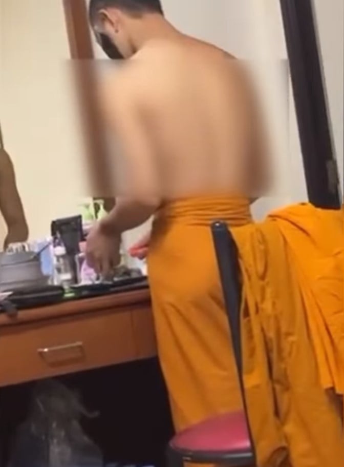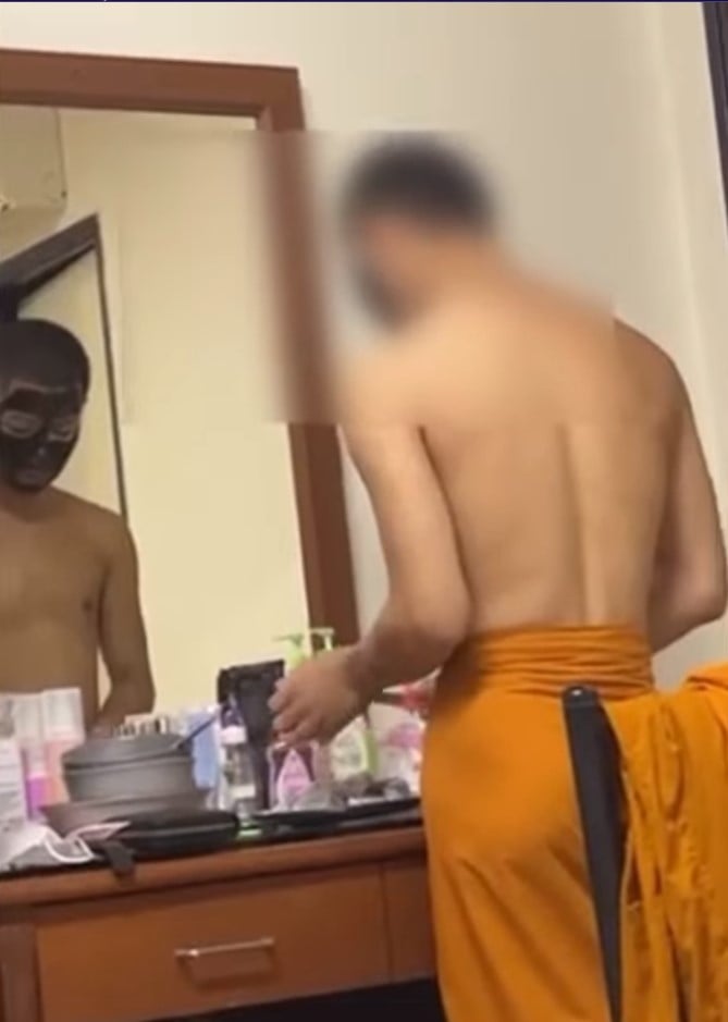 โดยในคลิปเราจะได้เห็นชายคนหนึ่ง นุ่งผ้าเหลืองคล้ายสบง จีวรของสงฆ์ครึ่งท่อนล่าง กำลังมาร์กหน้าสีดำ พร้อมมือก็กำลังปอกผลไม้ไปด้วย โดยสภาพในห้อง น่าจะเป็นห้องที่อยู่มานานแล้ว จากข้าวของบนโต๊ะและน้ำแพ็คก่อนที่ผู้ถ่ายคลิปจะเอ่ยปากแซวชายที่ปรากฎในคลิปว่า
