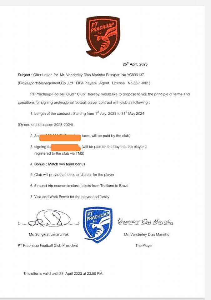ทว่าในเวลาต่อมา พีที ประจวบ เอฟซี นำโดย “บิ๊กหนุ่ม” ยุทธชัย ปริยวาที บอร์ดบริหารของสโมสร ได้มีการแสดงข้อมูลสัญญาออกมาตามโซเชียลว่าศูนย์หน้าชาวบราซิล ได้ตกลงเซ็นสัญญากับทัพ “ต่อพิฆาต” ไปในช่วงก่อนหน้านี้แล้ว ทำให้มีประเด็นถกเถียงกัน