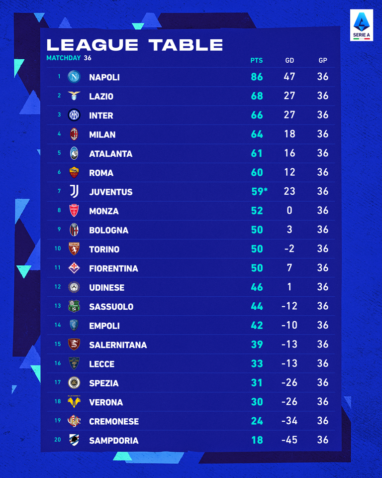 สถานการณ์ ตารางคะแนน ล่าสุด ของศึก กัลโช่ เซเรียอา หลังจบสัปดาห์ที่ 36 นั้น นาโปลี ที่การันตีแชมป์ไปแล้วมีเพิ่มเป็น 86 คะแนน ส่วน ลาซิโอ แซงขึ้นมารั้งอยู่ที่ 2 มี 68 คะแนน ด้าน อินเตอร์ ร่วงไปรั้งที่สามจากการมีแต้มหยุดอยู่ที่ 66 คะแนน ส่วน เอซี มิลาน รั้งที่สี่ มี 64 คะแนน ด้าน ยูเวนตุส ที่โดนลงโทษจากคดีทุจริตโดนตัด 10 แต้ม ร่วงไปอยู่ที่ 7 ของตารางมี 59 คะแนน