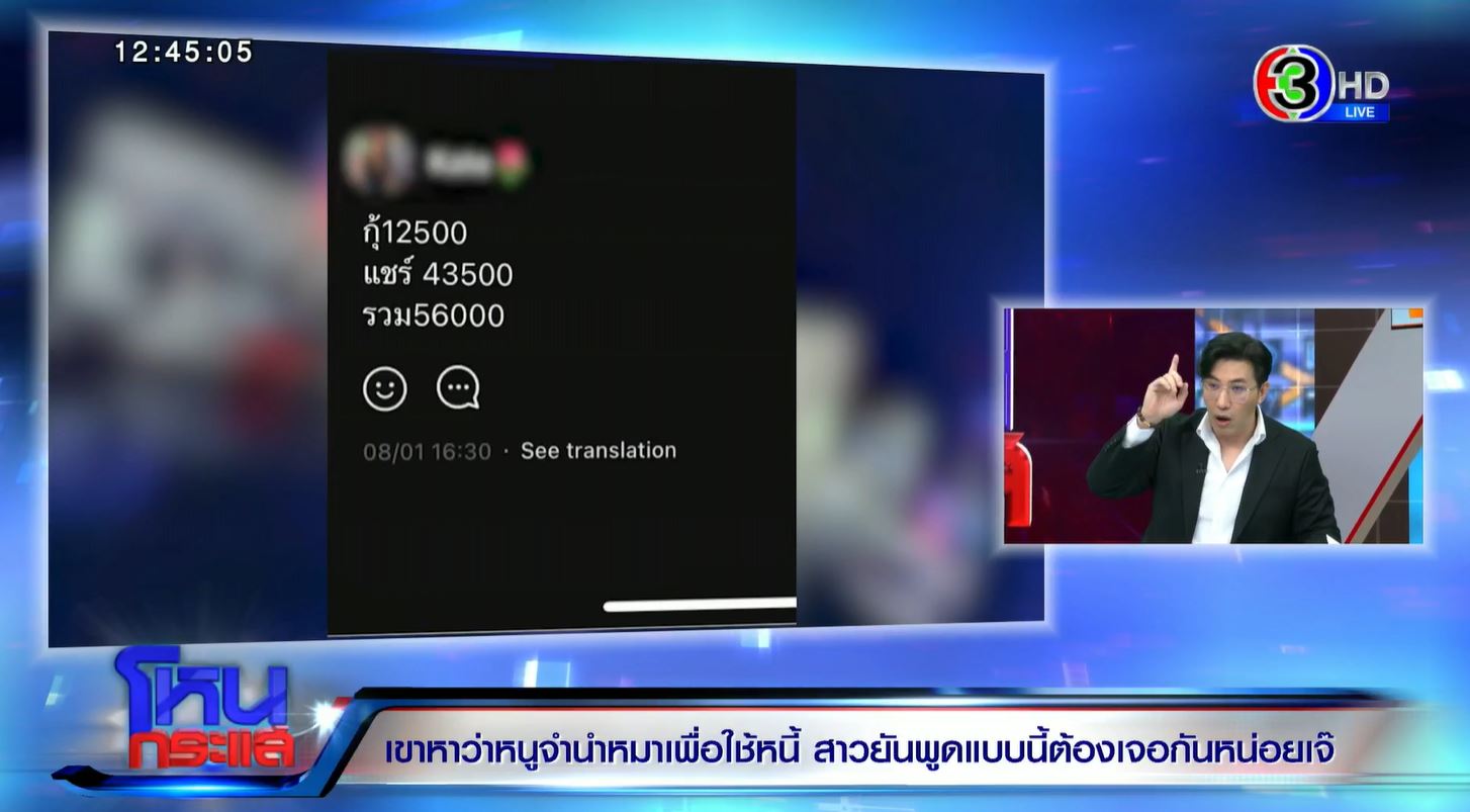 ขอบคุณภาพ-ข้อมูล : รายการโหนกระแส รับชมเทป Live โหนกระแส เขาหาว่าหนูจำนำหมาเพื่อใช้หนี้ สาวยันพูดแบบนี้ต้องเจอกันหน่อยเจ๊ คลิกที่นี่