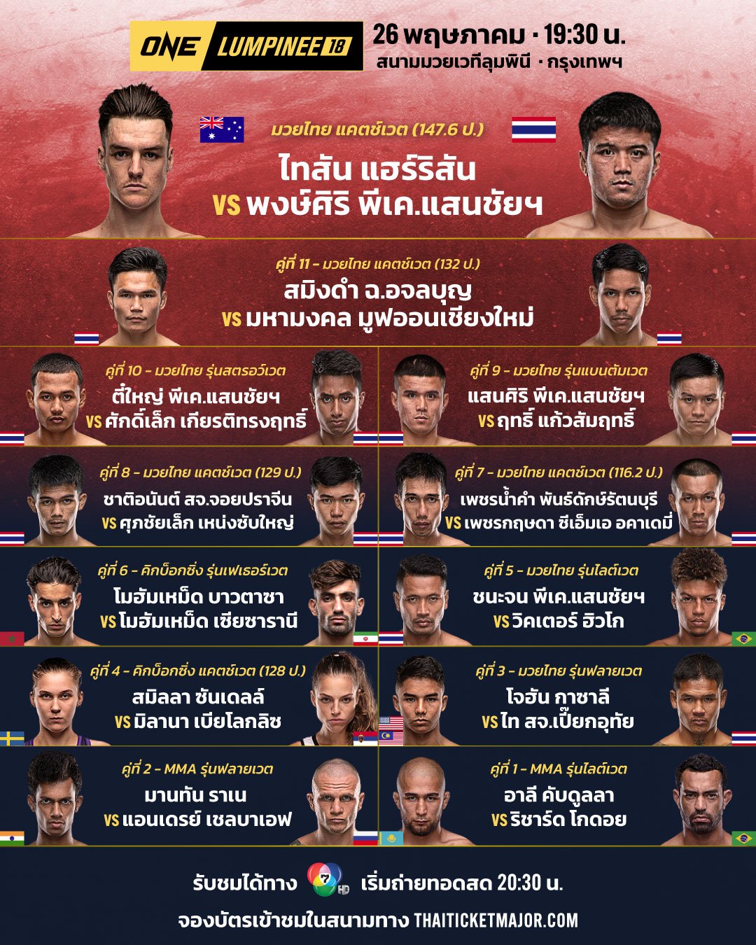 โปรแกรมมวย ONE ลุมพินี 18 ระเบิดความมันส์มวยวันศุกร์ ศึกมวย ONE ลุมพินี วันศุกร์ที่ 26 พฤษภาคม นี้ ถ่ายทอดสดทางช่อง 7HD กดเลข 35 (ภาษาไทย) เริ่ม 20.30 น. โปรแกรมมวย วันนี้ ศึก ONE Lumpinee 18 เช็คคู่แข่งขัน คู่เอก พร้อมช่องทางชมสดที่นี่ ตั้งแต่เวลา 2 ทุ่ม 30 นาทีเป็นต้นไป