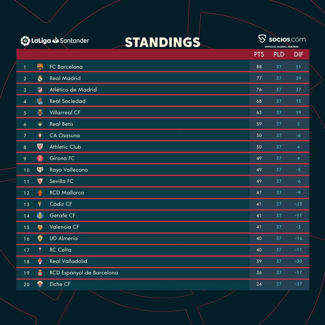 อันดับตารางคะแนน ลาลีกา สเปน 2022/2023 หลังจบนัดที่ 37 โดย 5 อันดับแรกในตารางเป็นไปตามลำดับมีดังนี้